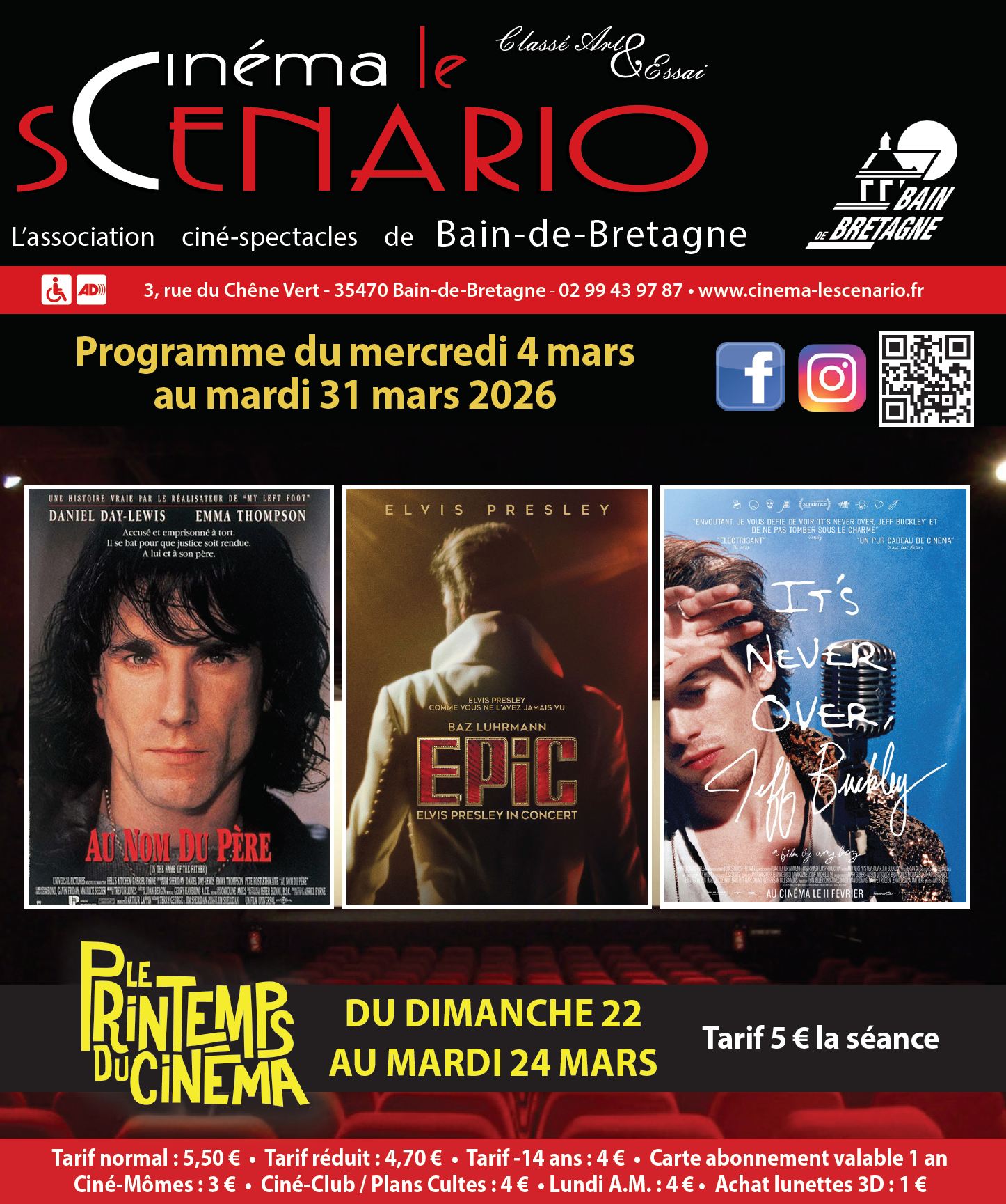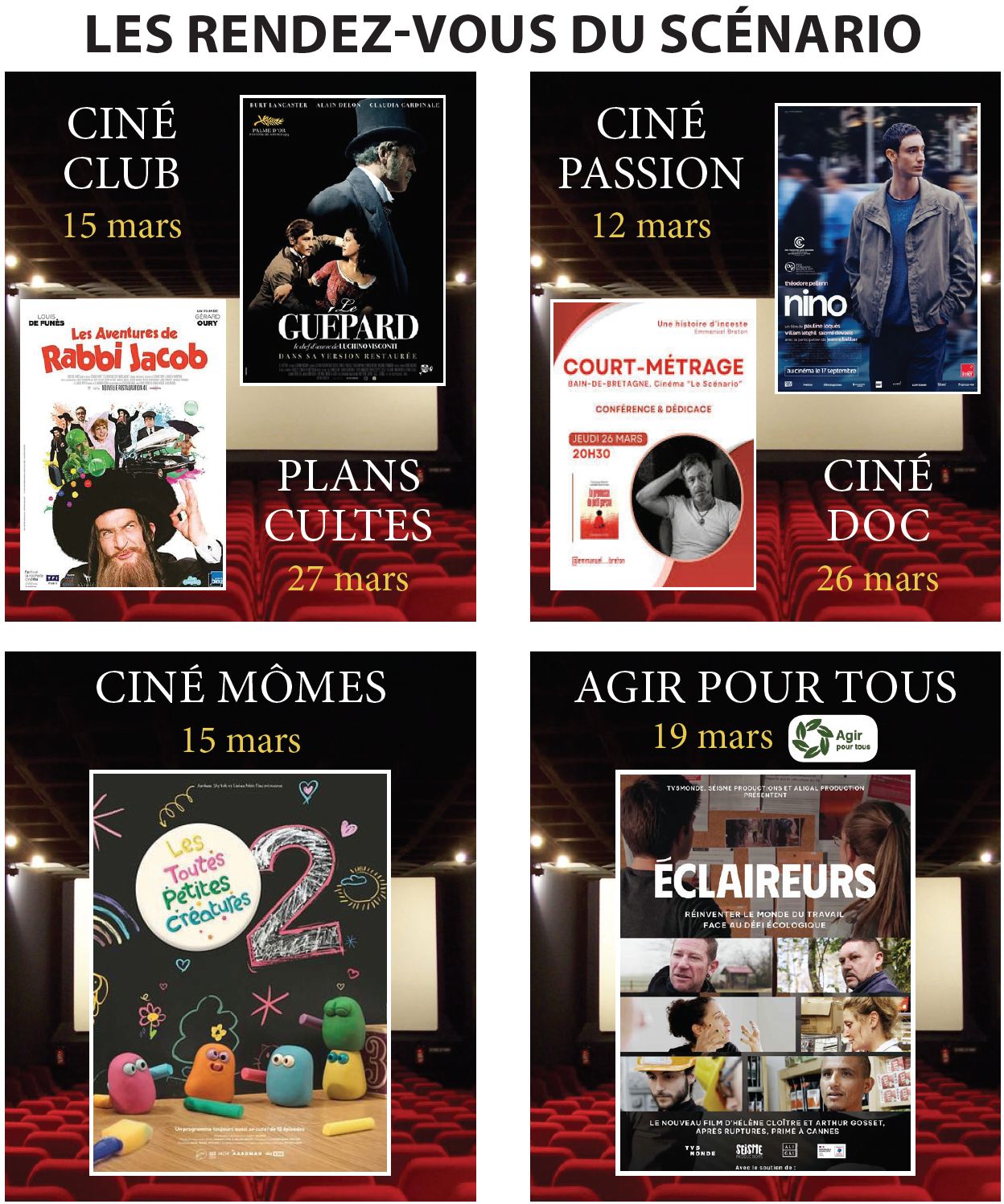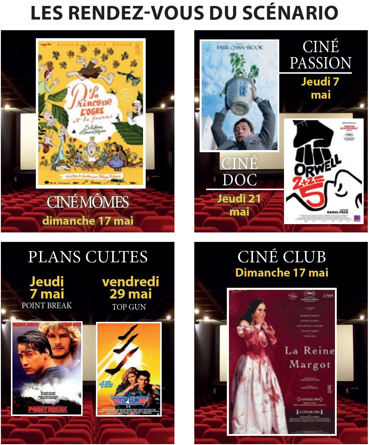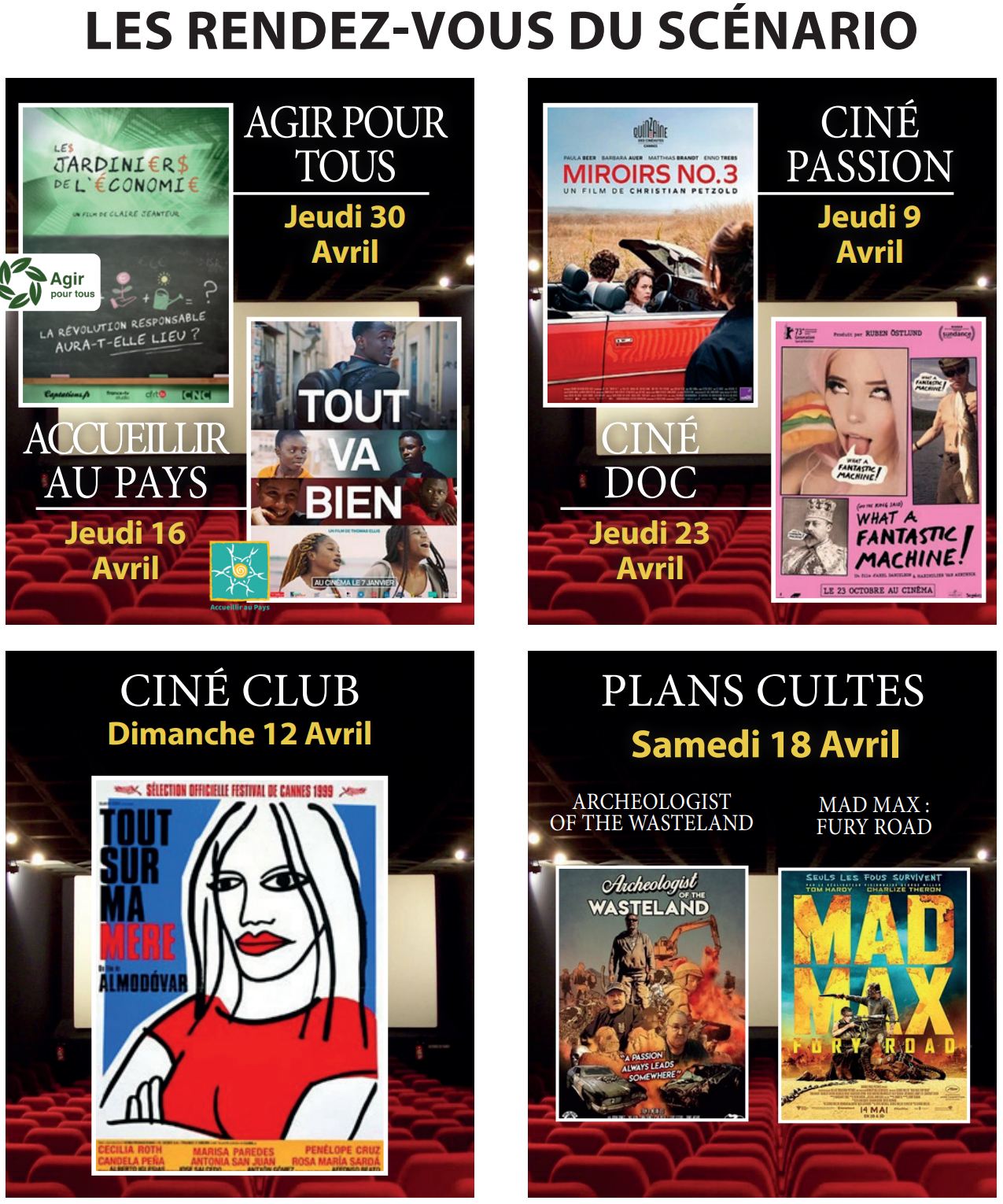 - L'horaire indiqué est l'heure de démarrage des films. Les portes ouvrent environ 45 min avant le début de la séance.