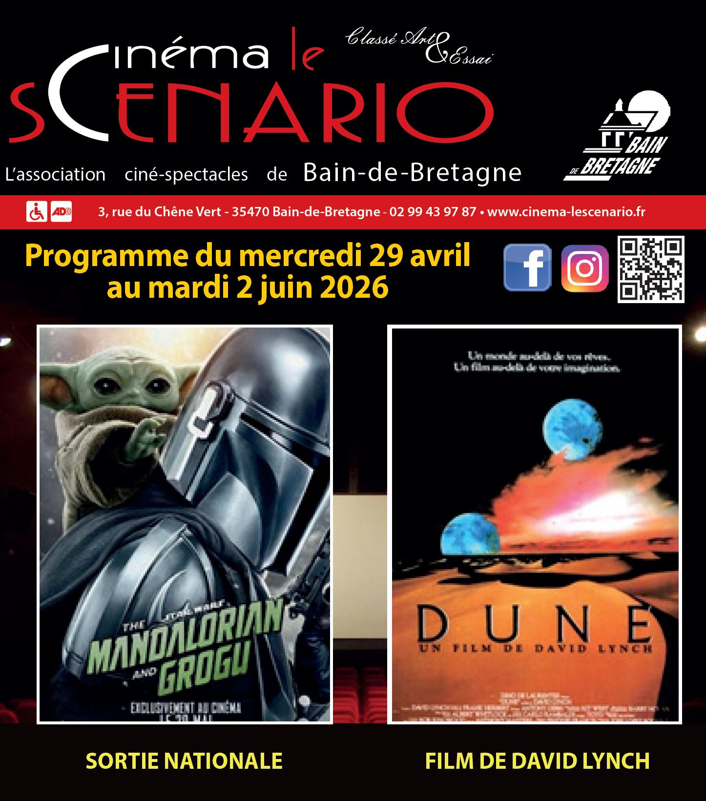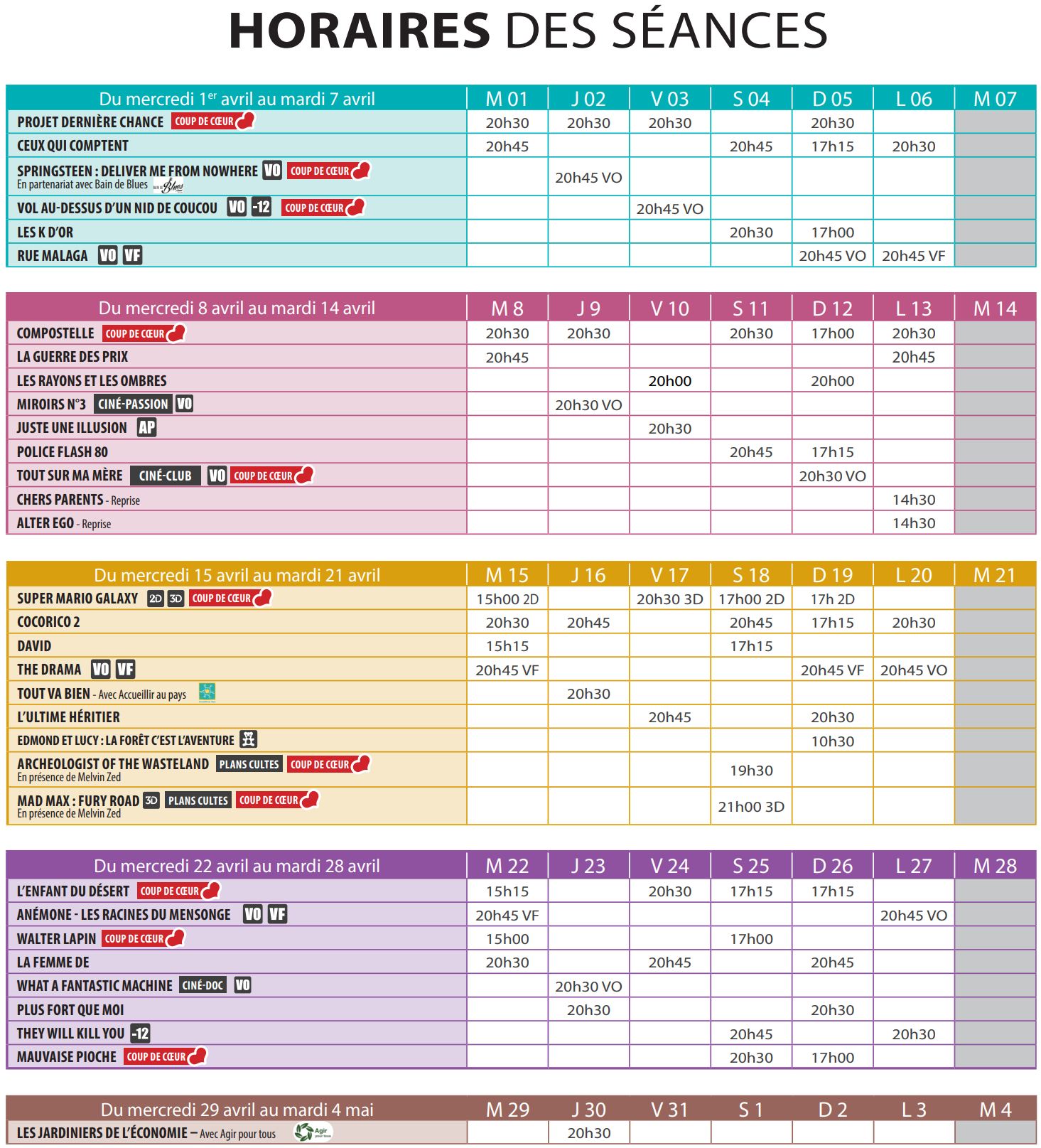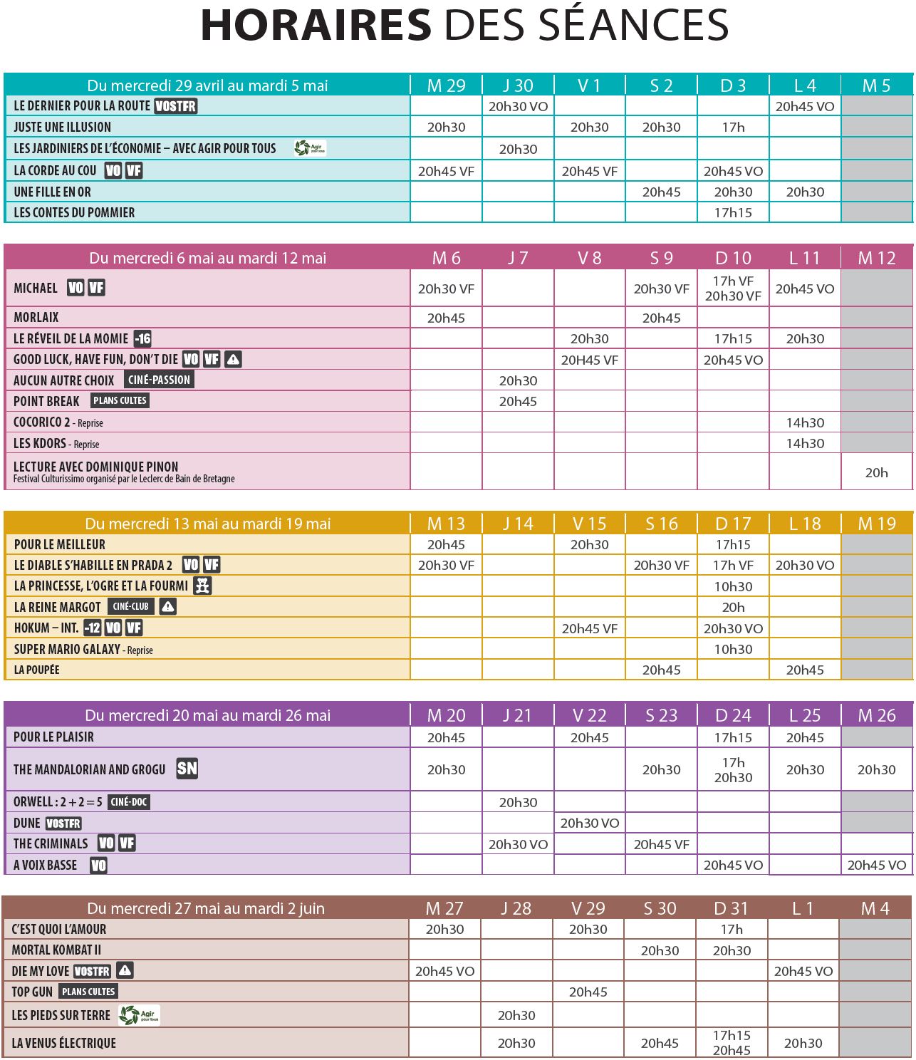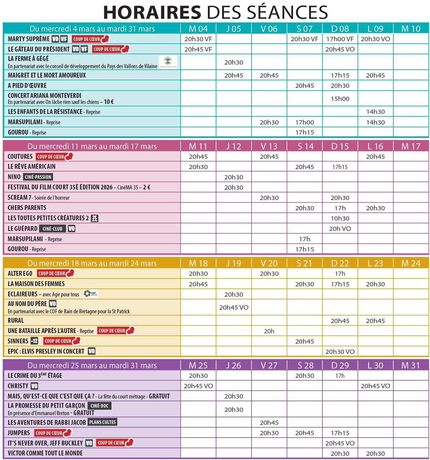- L'horaire indiqué est l'heure de démarrage des films. Les portes ouvrent environ 45 min avant le début de la séance.