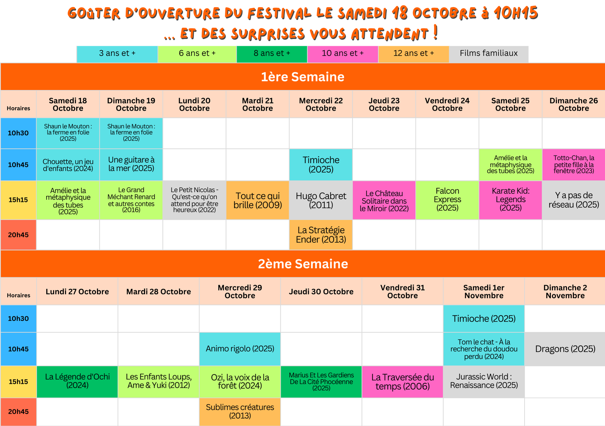 -> De nombreuses séances durant les vacances scolaires, les matins à 10h30 et 10h45, les après-midis à 15h15, ainsi que le mercredi à 20h45.